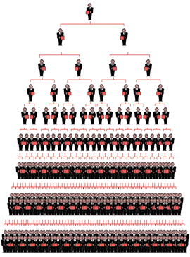 (2)计酬要件(财):包括两种形式,一种是承诺以参加者本人直接发展的下线人数和间接发展的下线人数为依据计算和给付报酬,即以直接和间接发展的人员数量计提报酬;另一种是承诺以参加者本人直接发展和间接发展的下线的销售业绩(即销售额)为依据计算和给付报酬,形成传销的“金钱链”。如果有人介绍“工作”“生意”或者“投资”,前提是要交钱,并且许诺只要发展他人参加,就可以从中提取诱人报酬,就要引起警惕了。