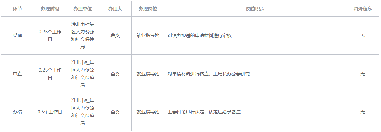 1.受理:申请人登录安徽政务服务网淮北分厅(http://hb.ahzwfw.gov.cn/)官方网站,根据项目服务指南内容,通过安徽政务服务网淮北分厅网上申报或直接向杜集区学院路与光明路交叉口1号杜集区政务服务中心人社综合窗口申请,窗口工作人员出具《受理通知书》。 2.审查:窗口工作人员将申请转交到承办人核查,对不符合要求的退回窗口,并出具《补正通知书》。窗口工作人员通知申请人,申请人可整改后重新申请。 3.办结:对审核通过的进行办结,对审核不通过的当场说明理由,并告知申请人依法享有申请行政复议或者提起行政诉讼的权利。