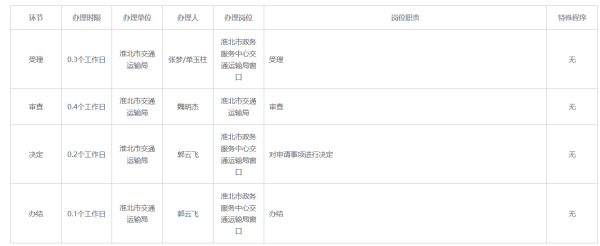 1.受理:申请人进入安徽政务服务网淮北分厅(http://hb.ahzwfw.gov.cn/)官方网站,根据项目服务指南内容备齐申请材料后,直接向市政务服务中心4楼交通运输综合窗口报送材料,窗口工作人员接收、核对,材料齐全且符合法定形式,出具《受理通知书》;申请材料不齐全或不符合法定形式,当场一次性告知需要补正的全部内容及标准。