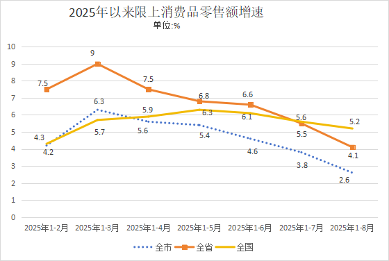 今年以来,全市上下持续推动一系列扩内需促消费政策落地见效,消费市场总体呈现平稳增长态势,但目前有效需求仍显不足,叠加以旧换新政策减弱,下行压力不断加大,还需加大稳增长力度。1-8月份,全市限上消费品零售额同比增长2.6%,增速较1-7月回落1.2个百分点,全省12位,位次比1-7月前移2位,其中8月份下降5.7%,全省13位。