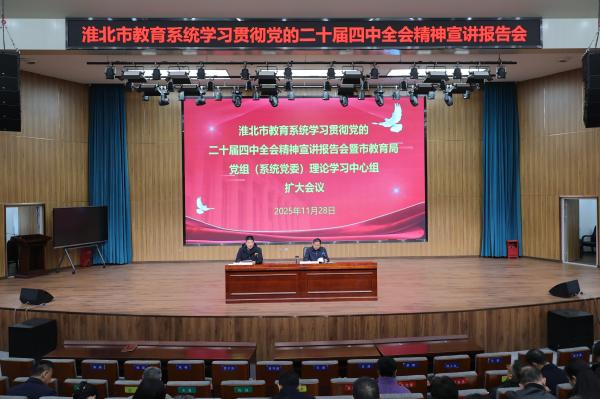 为传达学习党的二十届四中全会精神,落实省委教育工委和淮北市委学习贯彻全会精神的有关工作部署,11月28日下午,市教育局举行全市教育系统学习贯彻党的二十届四中全会精神宣讲报告会暨市教育局党组(系统党委)理论学习中心组扩大会议。市委宣讲团成员,市教育局党组书记、局长,教育系统党委书记郑晓野出席会议并做主题宣讲,市教育局党组成员、副局长王月辉主持会议。
