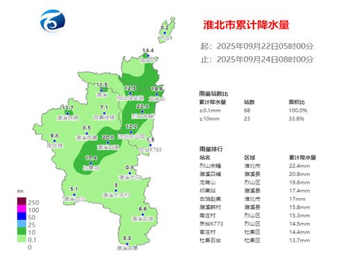 22日05时-24日08时降水量:全市普降小雨,部分地区中雨(见下图)。全市平均雨量8.5毫米,各区县平均雨量:相山区9.1毫米,杜集区9.6毫米,烈山区9.6毫米,濉溪县7.1毫米。淮北国家气象观测站8.6毫米,濉溪国家气象观测站11.5毫米,最大降水量22.4毫米,出现在烈山宋疃。