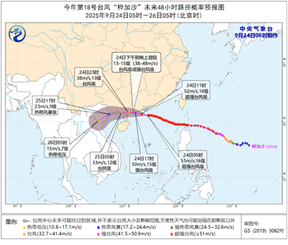 今年第18号台风“桦加沙”(超强台风级)的中心今天(24日)早晨5点钟位于广东省阳江市东偏南方向约255公里的南海北部海面上,就是北纬21.1度、东经114.3度,中心附近最大风力有16级(55米/秒),中心最低气压为930百帕,七级风圈半径250-380公里,十级风圈半径150公里,十二级风圈半径90公里。预计,“桦加沙”将以每小时20公里左右的速度向西偏北方向移动,将于24日下午到晚上在广东台山到湛江一带沿海登陆(台风级或强台风级,13-15级,38-48米/秒),登陆后强度逐渐减弱。我市处于降水北缘,总体风雨影响不大。