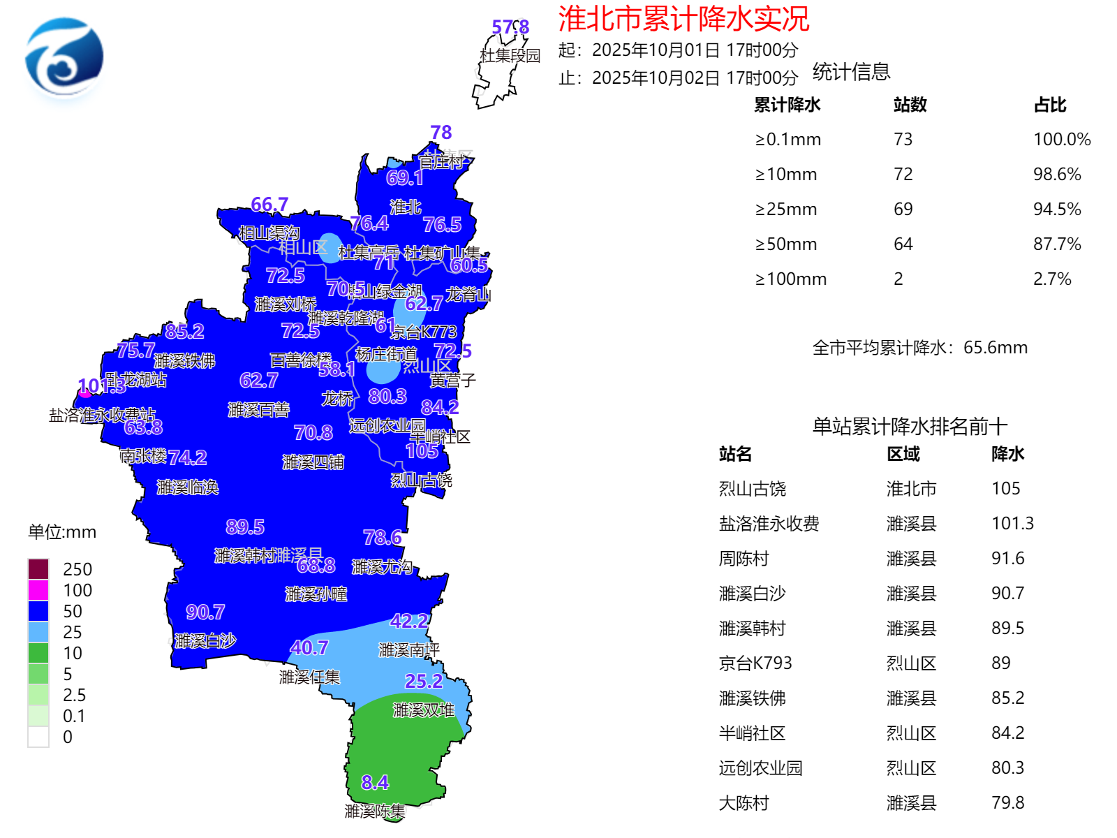 具体雨量:淮北国家气象观测站69.1毫米,濉溪国家气象观测站65.1毫米,最大降水量105毫米,最大小时雨强27.6毫米/小时,均出现在烈山古饶。