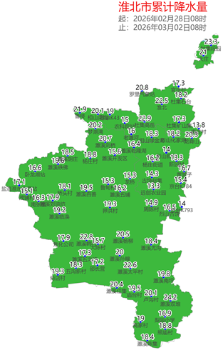 2月28日夜间至3月2日08时,受自然降水和人工增雨作业共同影响,全市普降中雨。全市平均雨量17.3毫米,其中相山区18.0毫米,杜集区19.5毫米,烈山区14.8毫米,濉溪县17.4毫米。淮北国家气象观测站22.5毫米,濉溪国家气象观测站19.0毫米。最大降水量24.2毫米,出现在濉溪双堆。