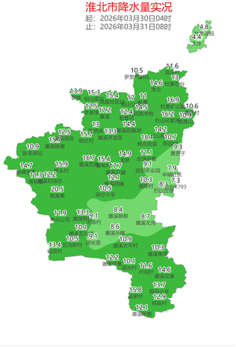 30日凌晨至今晨08时,受人工增雨作业和自然降水共同影响,全市普降小到中雨。全市平均雨量12.3毫米,其中相山区14.0毫米,杜集区11.4毫米,烈山区11.0毫米,濉溪县12.5毫米。淮北国家气象观测站14.6毫米,濉溪国家气象观测站17.2毫米。最大降水量18.1毫米,出现在杨庄街道。
