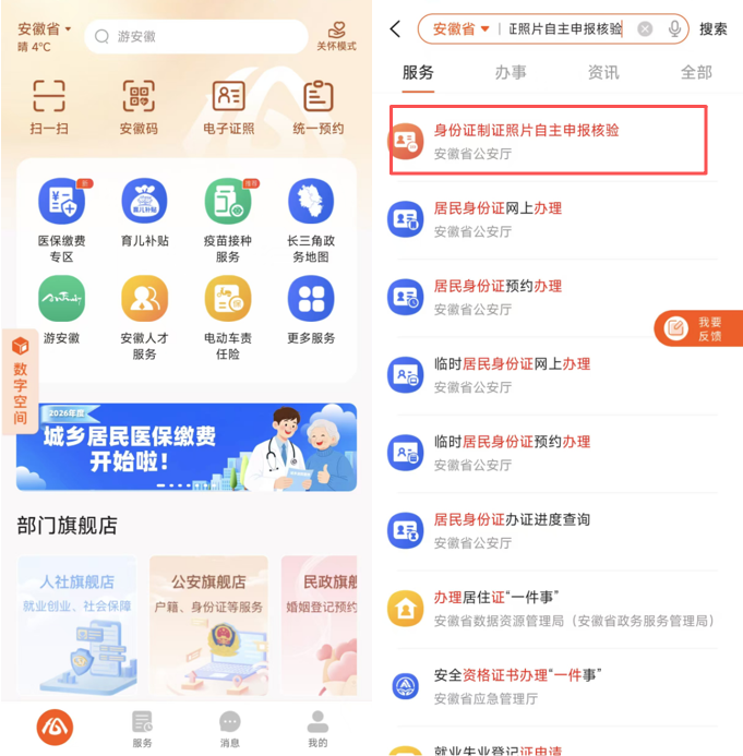 1.打开“皖事通”APP,在搜索框搜索“身份证制证照片自主申报核验”,点击进入。