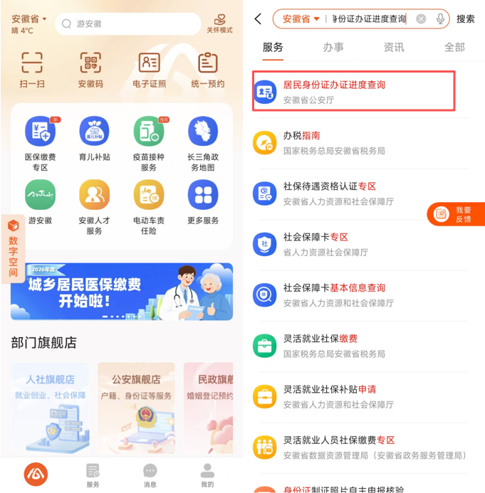 1.下载皖事通APP并注册登录,在首页搜索“居民身份证网上办理”。