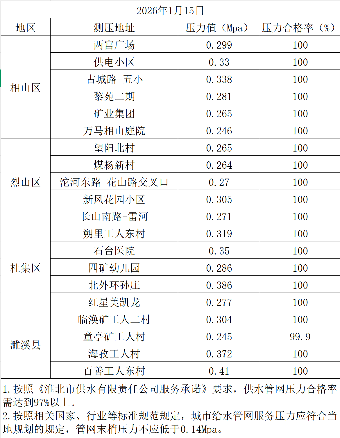 2026年1月15日水压抽测公示