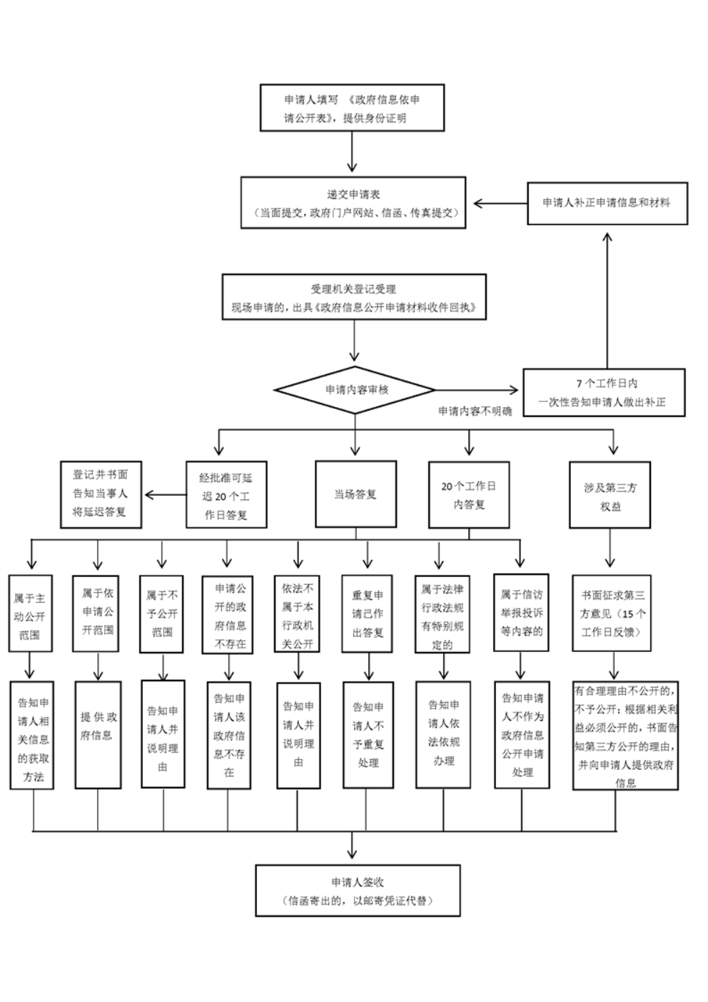 本机关收到申请后,将对申请内容进行审查,对政府信息公开申请内容不明确的,给予申请人指导和释明,并自收到申请之日起7个工作日内一次性告知申请人作出补正,并说明需要补正的事项和合理的补正期限。答复期限自行政机关收到补正的申请之日起计算。申请人无正当理由逾期不补正的,视为放弃申请,行政机关不再处理该政府信息公开申请。本机关收到政府信息公开申请,能够当场答复的,应当当场予以答复。本机关不能当场答复的,应当自收到申请之日起20个工作日内予以答复;需要延长答复期限的,应当经政府信息公开工作机构负责人同意并告知申请人,延长的期限最长不得超过20个工作日。申请公开的政府信息涉及第三方权益和其他机关的,本机关将征求第三方和其他机关的意见,征求第三方和其他机关意见所需时间不计算在上述规定的期限内。